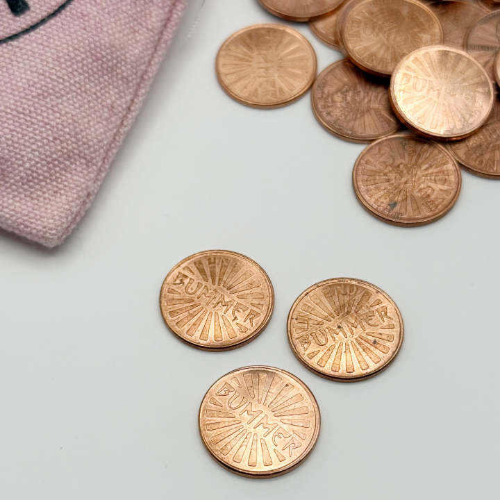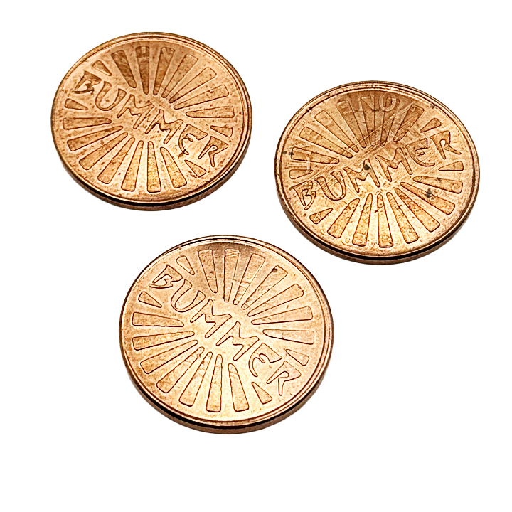 Please Note: Tokens will vary in appearance as each Bummer has come from pennies of varying circulation and tragic backstory. Tokens have given up on capitalism and cannot be used as legal tender.